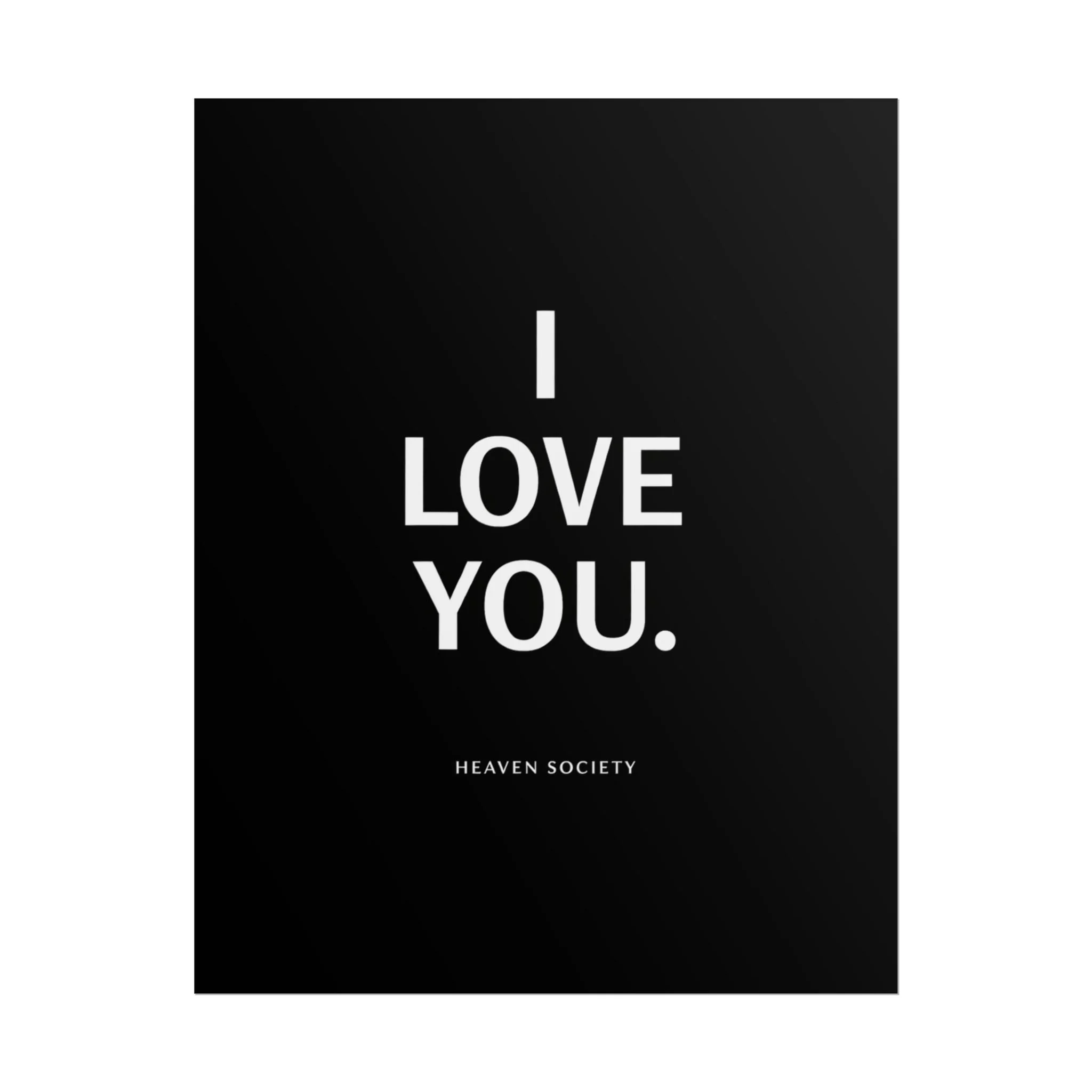 A minimalist rolled poster that speaks plainly and honestly: bold white type on a deep black field declaring "I LOVE YOU." The design is calm and modern, fitting into both intimate corners and bright contemporary walls. Choose between fine art, semi-glossy, or matte paper to match your space — textured archival paper for a painterly feel, satin-finish photo paper for vivid contrast, or a softer matte for understated elegance. Available in horizontal and vertical sizes, this poster ships rolled so you can frame or display it the way that feels right. It reads like a quiet, everyday reminder you leave on a shelf, a bedside wall, or above a desk — small, direct, and unmistakable.